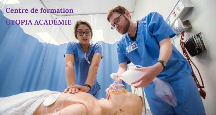 1. Réanimation Cardio-Respiratoire (RCR) : Vous apprendrez les techniques de base pour réagir face à une personne en arrêt cardiaque ou en arrêt respiratoire, accident vasculaire cérébral et d’anaphylaxie. Vous serez formé(e) à la reconnaissance des signes vitaux et à la mise en œuvre des gestes de réanimation, tels que la RCP (Réanimation Cardio-Pulmonaire) et l’utilisation d’un défibrillateur automatique externe (DAE) chez les adultes et les enfants.